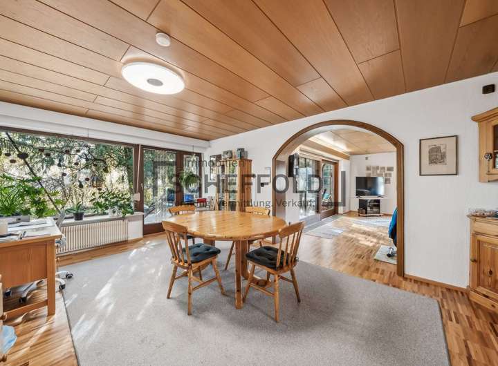 Am Ende des Flurs öffnet sich der lichtdurchflutete Essbereich, der durch seine angenehme Größe besticht. Hier finden nicht nur gemeinsame Mahlzeiten statt, sondern auch gemütliche Spieleabende, Geburtstagsfeiern oder gesellige Stunden mit Freunden und Familie. Von dort gelangen Sie in die angrenzende Küche, die zum Kochen und Genießen einlädt, mit Speisekammer die für Ordnung sorgt und ausreichend Stauraum für Vorräte bietet. Vom Esszimmer gelangt man ebenfalls in das großzügige Wohnzimmer, das mit seinen großen Fenstern viel Licht hereinlässt. Gestalten Sie hier Ihre persönliche Wohlfühloase, in der Sie gemeinsam mit Ihren Liebsten den Tag entspannt ausklingen lassen können. Von Wohn- und Esszimmer aus gelangen Sie direkt ins Herzstück, die Terrasse – ein Ort, der mit seinem Blick in den weitläufigen Garten zum Genießen, Entspannen und Verweilen einlädt. Der Garten selbst bietet reichlich Platz für spielende Kinder, gemütliche Grillabende oder einfach ruhige Stunden in der Sonne. Außerdem gibt es die Möglichkeit, den Garten als weiteres Baugrundstück zu nutzen.