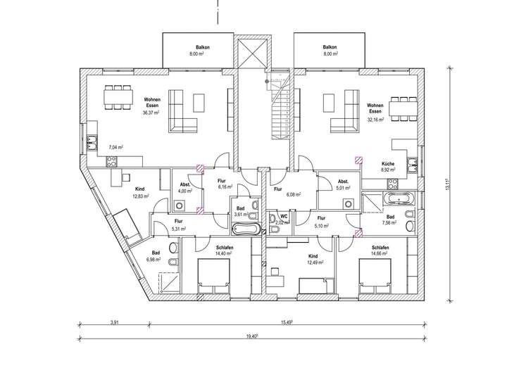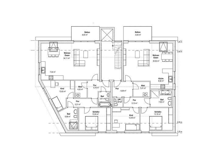 Dank der einheitlichen Struktur sind Umsetzung und Kostenplanung effizient, während die Wohnungsgrößen optimal auf den lokalen Miet- und Kaufmarkt abgestimmt sind.