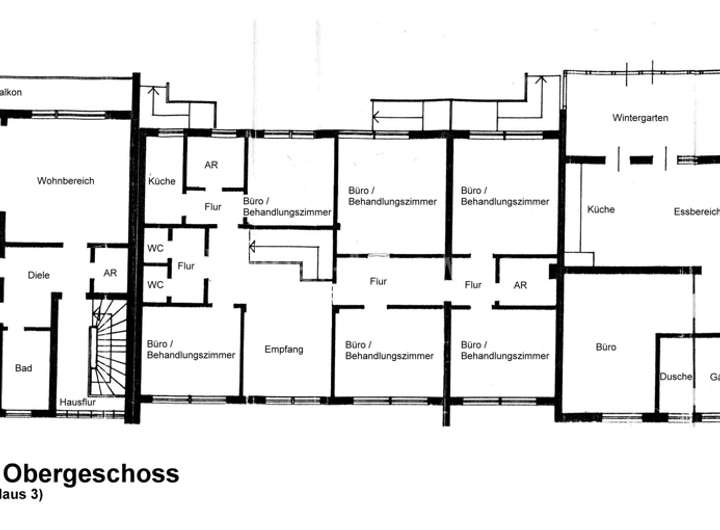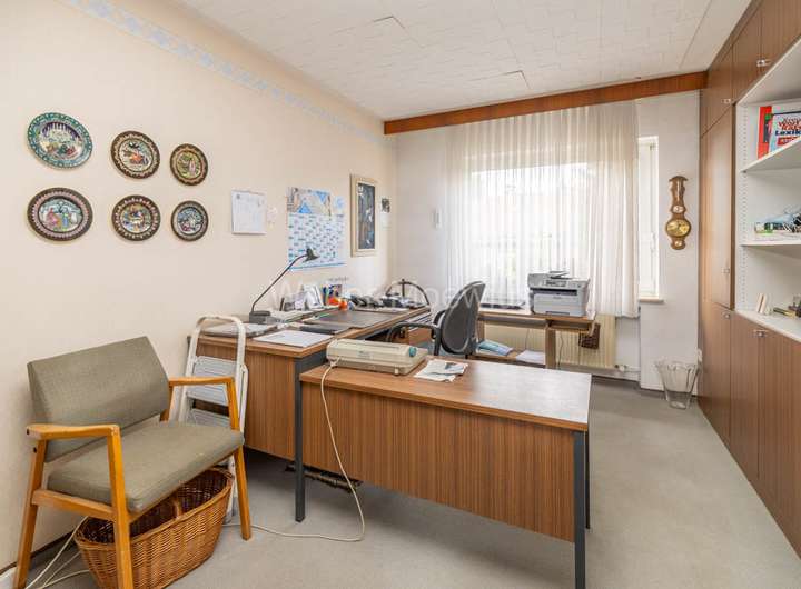 Die Häuser 1 und 2 wurden im Jahr 1976 auf zwei benachbarten Grundstücken mit Flächen von 812 m² bzw. 711 m² in solider Massivbauweise errichtet. Sie verteilen sich auf Unter-, Erd- und Obergeschoss und bieten insgesamt eine Wohnfläche von etwa 280,63 m², zuzüglich Nutzfläche im Untergeschoss von Haus 1. Zudem stehen in Haus 2, das Praxen und Büros im Obergeschoss beherbergt, etwa 153,11 m² Gewerbefläche zur Verfügung. Haus 3 wurde 1967 auf einem angrenzenden Grundstück mit 1.197 m² gebaut. Es umfasst Unter-, Erd-, Dachgeschoss sowie eine Speicherebene und bietet eine Wohnfläche von rund 222,07 m² zuzüglich Nutzfläche.