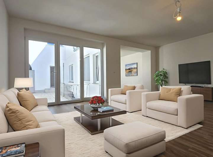 Über den Flur gelangen Sie zum modern ausgestatteten Badezimmer im ersten Stock sowie in den ruhig gelegenen Wohnbereich. Das Wohnzimmer mit direktem Zugang zur Terrasse bietet einen schönen Blick auf den Innenhof und lädt zum Entspannen ein.
