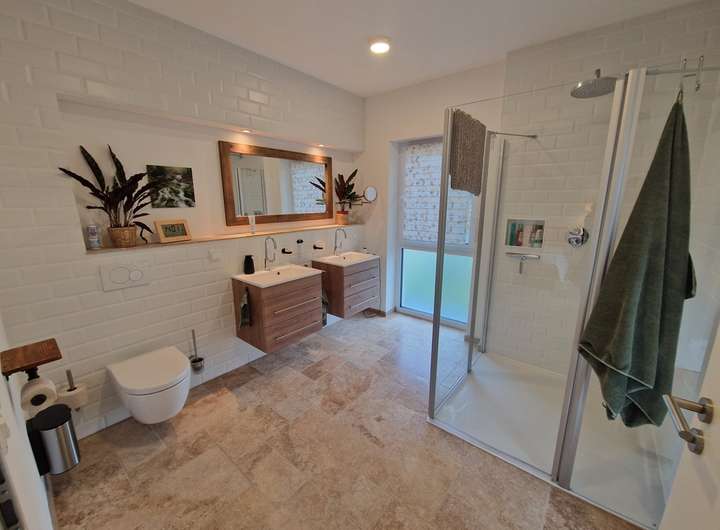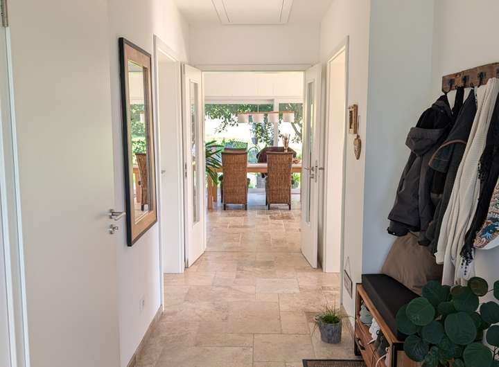 Hier wurde von Seiten der Eigentümer Wert auf eine moderne, stilvolle Ausstattung und gehobene Qualität gelegt. Zur Ausstattung zählen u.A. eine Wärmepumpe, Fußbodenheizung, Kaminofen von Hark, Klimaanlage, Photovoltaikanlage, dreifachverglaste und teils bodentiefe Fenster mit elektrischen Rollläden (mehr dazu siehe "Ausstattung"). Es bestehen überwiegend breite Innentüren und großzügig geschnittene, lichtdurchflutete Räume.