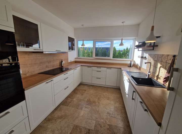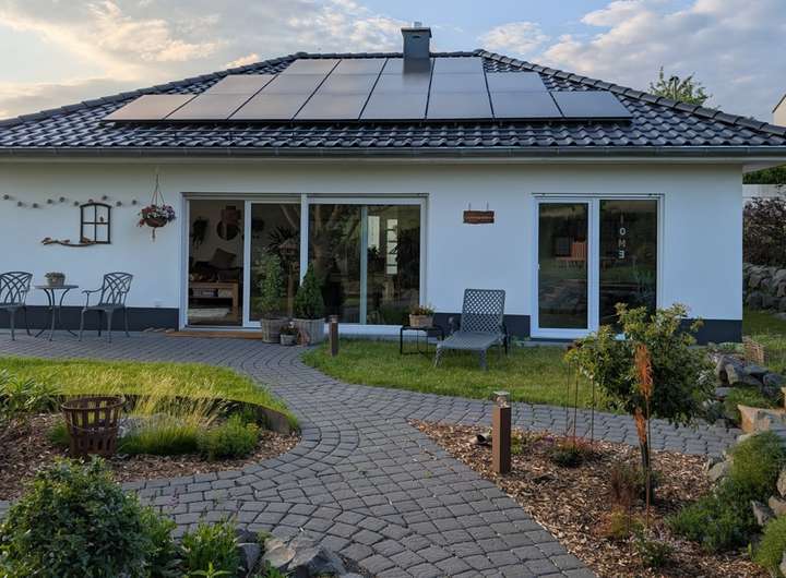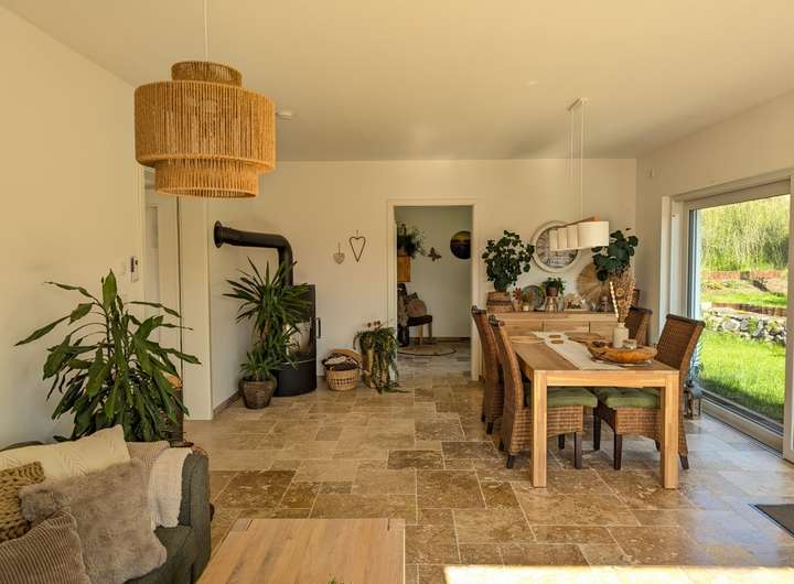 Niedrigenergiehaus "KfW 55 Standard", Energieeffizienzklasse "A", Wärmepumpe (Wolf), Fußbodenheizung, Kaminofen (Hark), Klimaanlage (Panasonic), Photovoltaikanlage (10,4 kWp), Pufferspeicher (1000 l), Frischwasserstation, dreifachverglaste und teils bodentiefe Fenster mit elektrischen Rollläden und maßangefertigten Fliegengittern, hochwertige Einbauküche (Nolte), Bodenbeläge: Fliesen (Travertin), überwiegend breite Innentüren und großzügig geschnittene Räume, Internetgeschwindigkeit: 1 GB/s, Regenwasserzisterne zur Gartenbewässerung (4000 l), großzügige Doppelgarage mit Wallbox (11 kW)