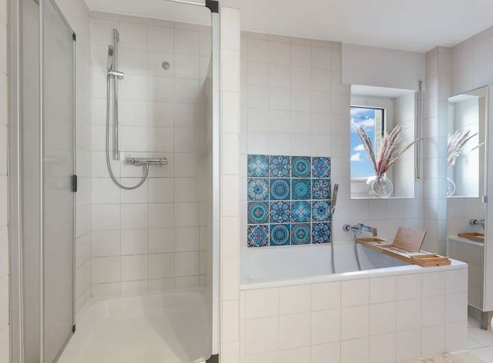 Im ersten Obergeschoss befindet sich das Elternschlafzimmer mit begehbarem Kleiderschrank sowie das erste von insgesamt drei potenziellen Kinderzimmern. Das großzügige Badezimmer ist sowohl mit einer Badewanne als auch mit einer Dusche ausgestattet – ein Ort zum Entspannen und Wohlfühlen.