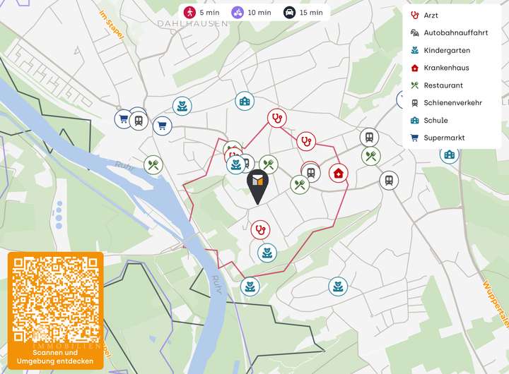 Ein besonderes Highlight der Lage ist die fußläufige Nähe zur Ruhr. In nur wenigen Minuten erreicht man die naturnahen Wege entlang des Flussufers – ideal für Spaziergänge, Joggingrunden, Fahrradtouren oder einfach zum Entspannen im Grünen. Diese direkte Nähe zu Natur und Wasser sorgt für eine hohe Lebensqualität und macht die Wohnlage besonders reizvoll.