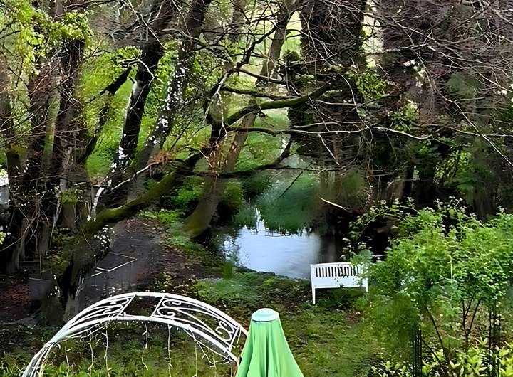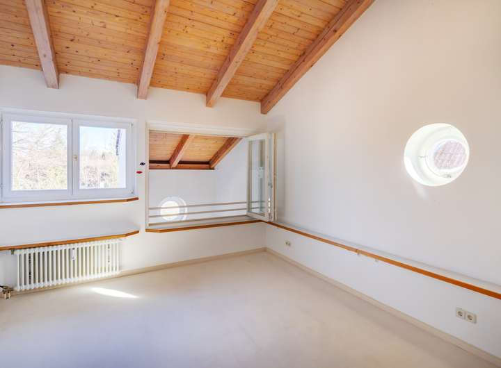 Der Essbereich mit bodentiefen Fenstern und Blick ins Grüne grenzt direkt an die separate Küche – ideal für Familien und Genießer. Das weitläufige Wohnzimmer öffnet sich zur sonnigen Dachterrasse in Südost-Ausrichtung. Über eine charmante Wendeltreppe gelangt man in den privaten Garten mit direktem Zugang zur idyllischen Würm – ein echtes Unikat.
