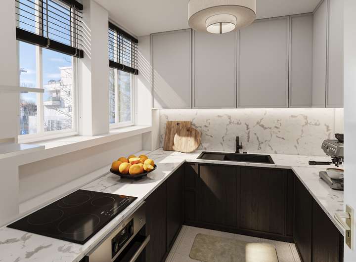 Die separate, U-förmige Küche ist ideal angebunden an den Essbereich – perfekt für gemeinsames Kochen und gesellige Abende. Helle Bodenbeläge verleihen den Räumen eine freundliche, einladende Note.
