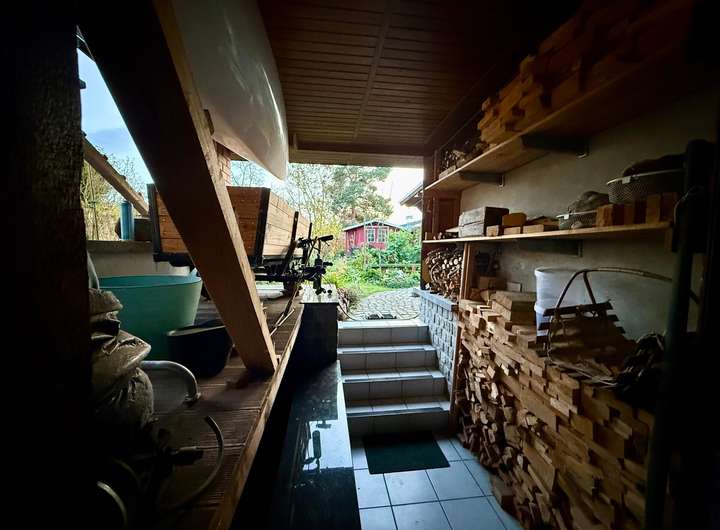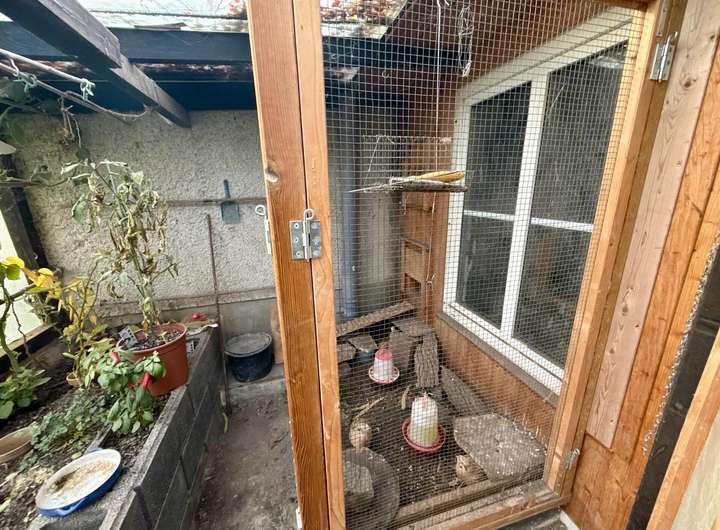 -Außenbereich: Terrasse, kleine Voliere, Geräteschuppen, Abstellfläche