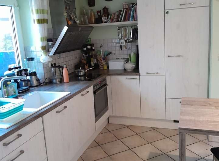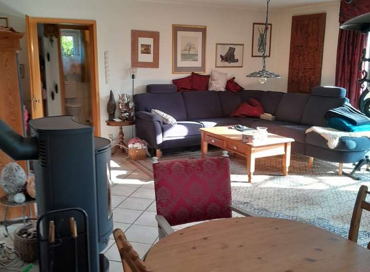 Der große Wohn- und Essbereich, der durch die Fenster viel Tageslicht hereinlässt und der neue Ofen schaffen eine angenehme Atmosphäre. Angrenzend befindet sich eine Küche, die reichlich Platz bietet.