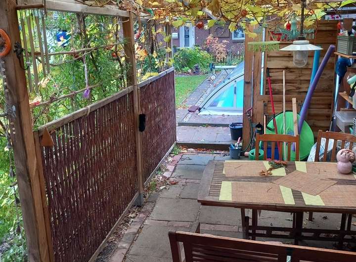 Ein besonderes Highlight des Hauses ist der Salzwasser-Außenpool mit verschiebbarer Überdachung. der den perfekten Ort bietet, um den Garten in vollen Zügen zu genießen. Der große, eingezäunte Garten ist eine wahre Oase der Ruhe, ausgestattet mit einem kleinen Teich und einem charmanten Gartenhaus, wo Sie entspannen und gärtnern können. Eine Garage rundet dieses attraktive Angebot ab, indem sie nicht nur Platz für Ihr Fahrzeug, sondern auch zusätzliche Lagermöglichkeiten bietet.