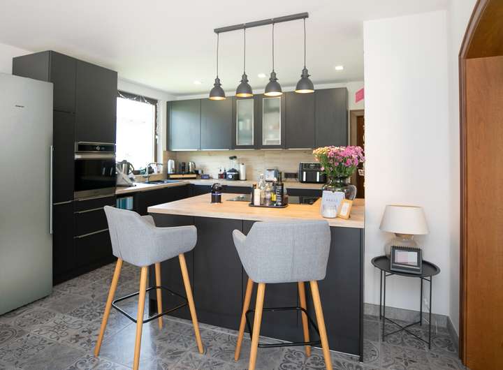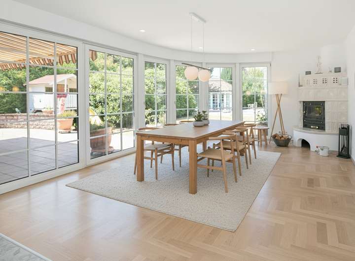 Der helle Wintergarten, Anfang der 1990er Jahre angebaut, bildet das Herzstück des Hauses. Zusammen mit der offenen Küche entsteht hier ein Raum, der den Alltag verbindet – ob beim gemeinsamen Essen, Lernen oder Entspannen mit Blick in den Garten. Von hier aus führt der direkte Zugang auf die Terrasse, die sich ideal für Mahlzeiten im Freien oder gesellige Runden eignet.