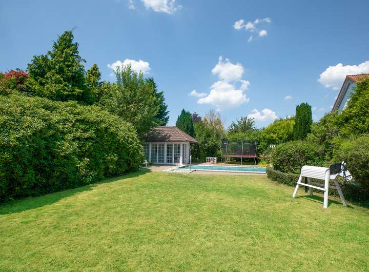 Das Grundstück ist weitläufig und gepflegt – mit Außenpool, Poolhaus und Gartenbereichen, die ausreichend Platz für Freizeit und Erholung bieten. Eine großzügige Garage und ein zusätzlicher Stellplatz runden das Angebot ab.