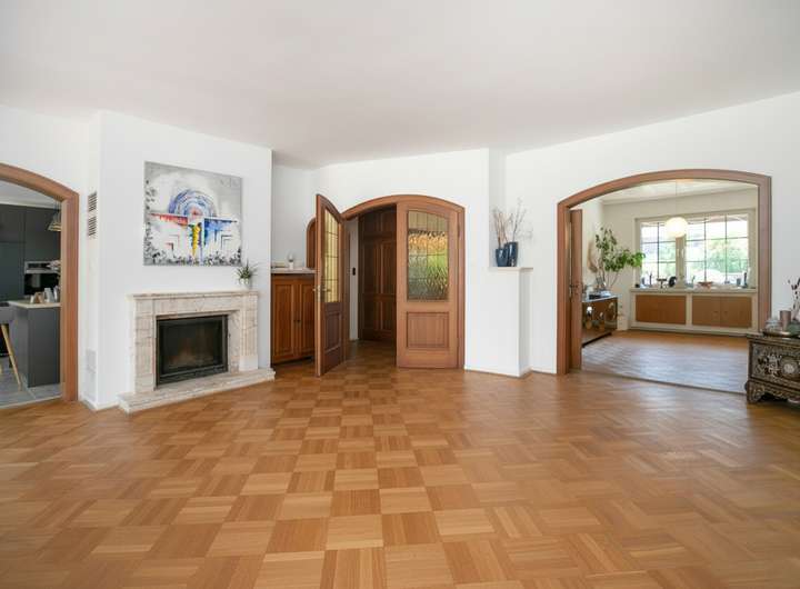 Das große Wohnzimmer mit Kamin schafft eine angenehme Atmosphäre für ruhige Abende. Die angrenzende Bibliothek, derzeit als Esszimmer genutzt, bietet Platz für größere Runden oder kann flexibel umgestaltet werden.