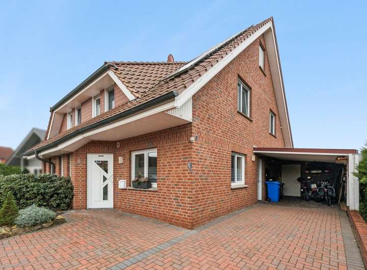 Schon beim Betreten des Hauses spürt man die angenehme Wohnatmosphäre, die diese Immobilie so besonders macht. Der Eingangsbereich führt in den großzügigen, lichtdurchfluteten Wohn- und Essbereich, der mit seinen großen Fensterflächen und dem direkten Zugang zur Terrasse und in den Garten begeistert. Hier verbinden sich Komfort und Behaglichkeit zu einem Ort, an dem man sich sofort zu Hause fühlt. Die geräumige Küche mit angrenzendem Hauswirtschaftsraum bietet ausreichend Platz und schafft mit kurzen Wegen eine ideale Verbindung. Ein Gäste-WC rundet das Erdgeschoss praktisch ab. Im Obergeschoss erwarten Sie ein geräumiges Schlafzimmer mit Blick ins Grüne, zwei helle Kinder- oder Arbeitszimmer sowie ein modernes Badezimmer mit Dusche und Badewanne. Die Grundrisse zeigen eine klare, funktionale Raumaufteilung. Ein Carport direkt am Haus sorgt für bequemen Schutz Ihres Fahrzeugs und bietet zusätzlichen Stauraum.