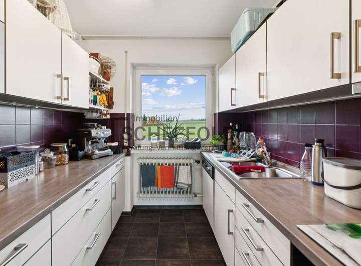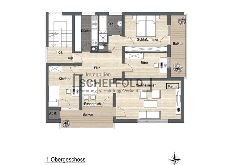 Die Wohnung im 1. Obergeschoss präsentiert sich baugleich und begeistert ebenso durch ihre helle, freundliche Atmosphäre. Statt einer Terrasse lädt hier ein zusätzlicher Balkon – erreichbar vom Schlafzimmer und Büro – zum Verweilen ein. Im Wohnzimmer sorgt ein Kaminofen für wohlige Wärme und schafft ein behagliches Ambiente. Die moderne Einbauküche ist zeitlos gestaltet und bietet alles, was das Herz begehrt. Diese Wohnung strahlt das Gefühl von Zuhause aus – ein Ort zum Ankommen und Wohlfühlen.