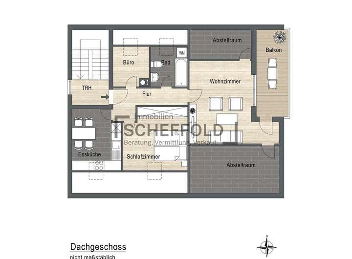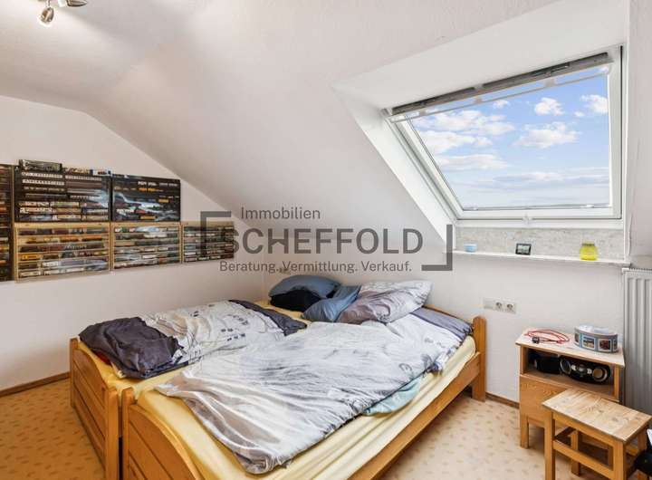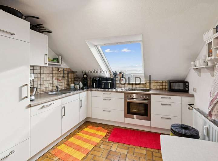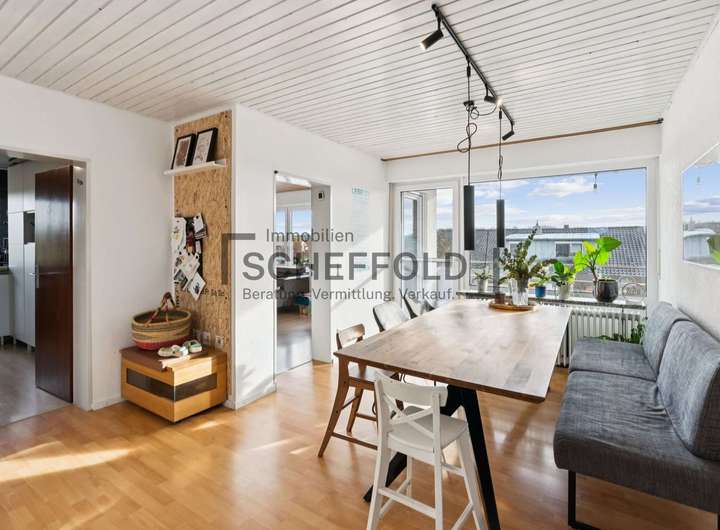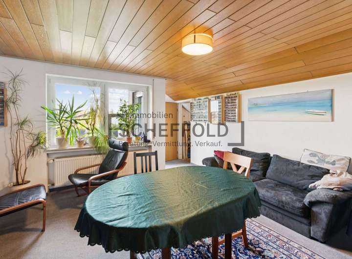 Auch die Dachgeschosswohnung überzeugt mit ihrem individuellen Charme. Holzvertäfelungen verleihen ihr eine gemütliche Atmosphäre, während Dachfenster für viel Licht und Wohnlichkeit sorgen. Der lange Flur verbindet alle Räume: die helle Essküche mit Einbauküche, das freundliche Wohnzimmer mit Balkon in Sonnenlage sowie das Schlafzimmer und Büro. Das Tageslicht-Badezimmer mit Badewanne und Waschmaschinenanschluss ist funktional und hell gestaltet. Zwei praktische Abstellräume ergänzen das Raumkonzept perfekt.