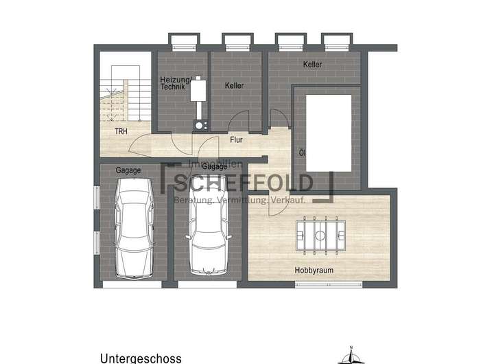 Im Untergeschoss erwarten Sie ein Heiz- und Technikkeller sowie ein separater Öllagerraum. Von hier aus haben Sie direkten Zugang zu zwei Einzelgaragen. Zwei weitere Kellerräume sind den Wohnungen im Erd- und Obergeschoss zugeordnet und bieten zusätzlichen Stauraum. Ein besonderes Highlight ist der beheizbare Hobbyraum, der flexibel nutzbar ist – ob als Fitnessbereich, Werkstatt oder zusätzlicher Wohnraum für Gäste.