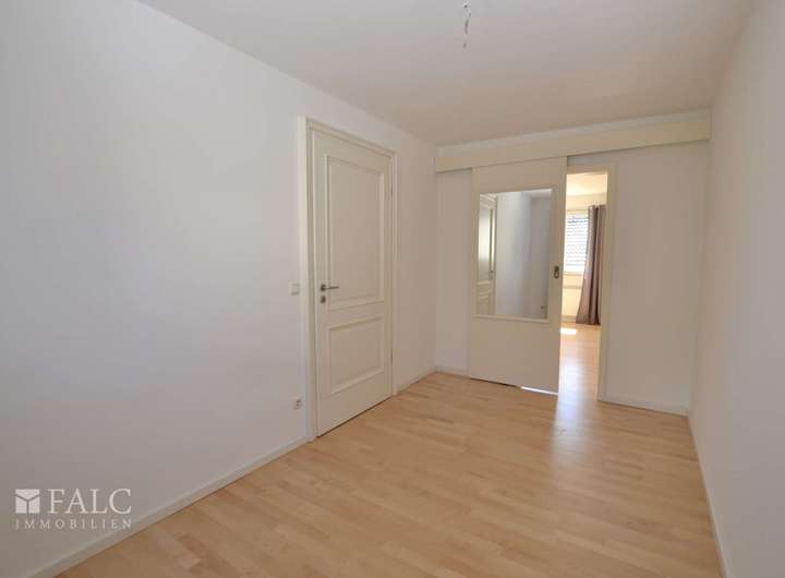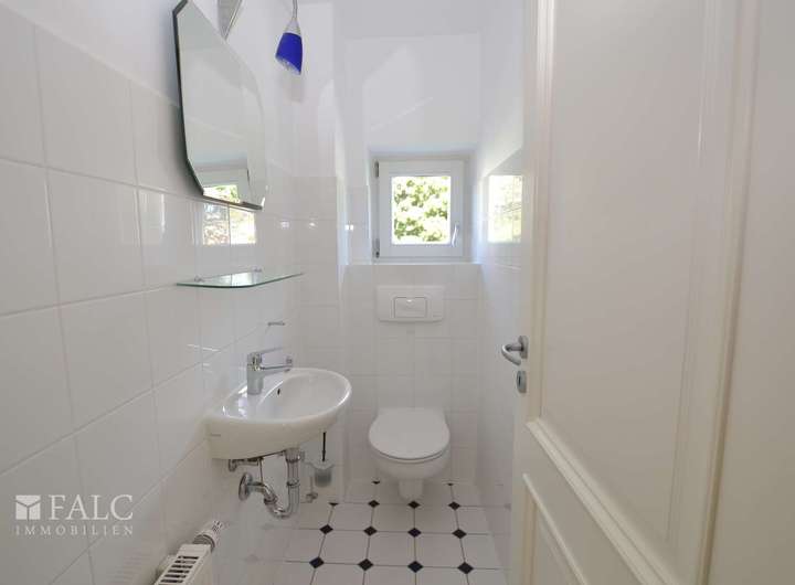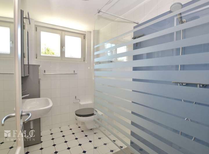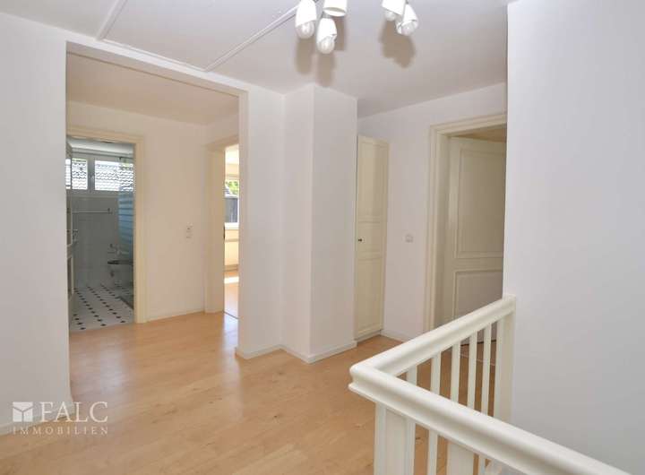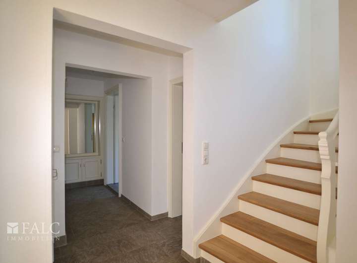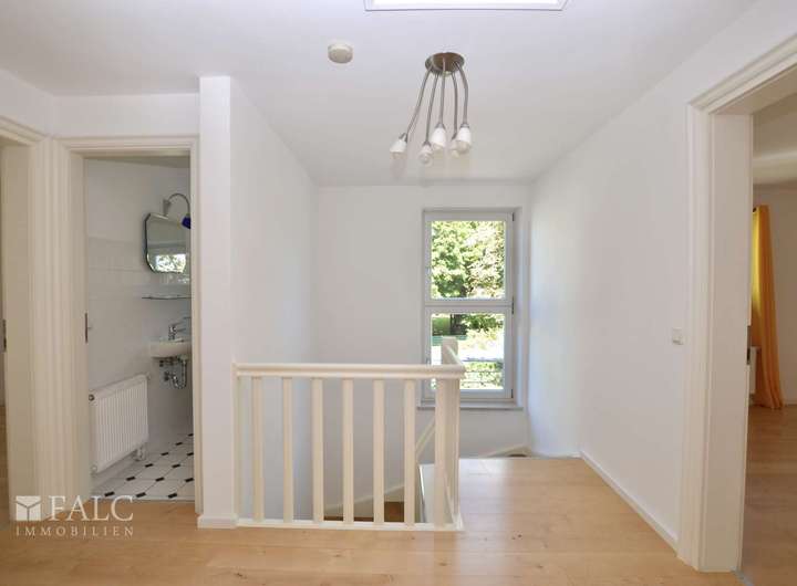 Im Obergeschoss befinden sich alle Schlafzimmer, ein separates Gäste-WC sowie ein elegantes Tageslichtbad mit bodenebener Dusche und Spiegeltür. Von zwei der Schlafzimmer aus gelangt man zudem direkt auf einen sonnigen Balkon, der einen schönen Blick ins Grüne bietet. Die maßgefertigte Treppe fügt sich harmonisch in das stilvolle Gesamtbild ein.