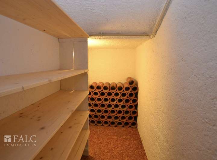 Ein besonderes Highlight im Untergeschoss ist der stilvolle Weinkeller mit temperierendem Tonröhrenlager. Zusätzlich gibt es einen hellen Büro-/Hobbyraum mit Gartenblick, einen großzügigen Wasch- und Trockenraum sowie moderne Heiz- und Lagerräume. Auch hier wurden hochwertige Fliesen und Fenster von Bayerwald verbaut.