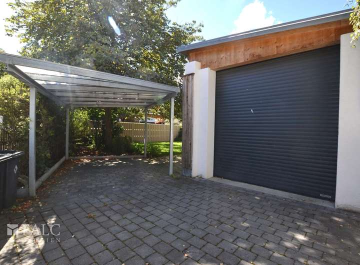 Der Garagenbereich mit angeschlossenem offenem Lager- und Abstellraum sowie einer KFZ-Grube besticht durch seine Großzügigkeit und bietet selbst für einen Camper Van Platz. Ausgestattet mit einer Wallbox erfüllt er moderne Ansprüche. Direkt neben dem Garagenbereich steht ein Carport zur Verfügung, für den die Wallbox ebenfalls nutzbar ist.