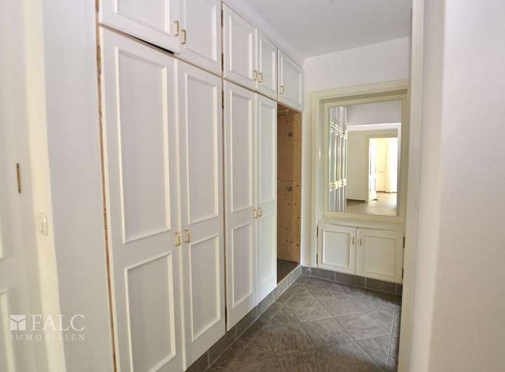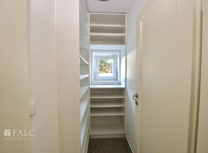 Der Eingangsbereich empfängt Sie mit maßgefertigten Einbauschränken und einer Sicherheitstür von Bayerwald. Hochwertige weiße Holzfenster, cremeweiße Innentüren und edles Eichenparkett verleihen allen Etagen eine helle, warme Atmosphäre.