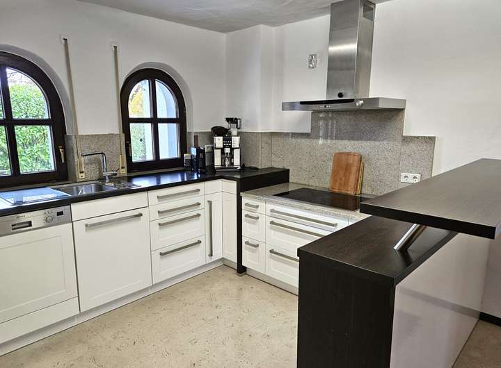 Der großzügige Wohnraum mit Kaminofen bildet das Herzstück des Hauses. Die moderne Einbauküche im Erdgeschoss ist mit hochwertigen Geräten ausgestattet und bietet direkten Zugang zum angrenzenden Hauswirtschaftsraum. Die angrenzenden Dreifachgarage verfügt über eine Wallbox und elektr. Toren.