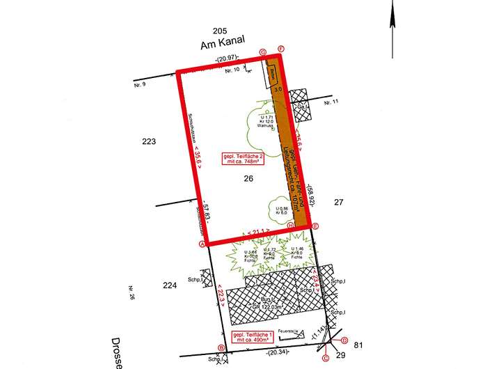 wenige Meter vom Teltowkanal entfernt. Es handelt sich um eine bereits vermessene Teilfläche mit einer Straßenfront von rd. 21 m und einer durchschnittlichen Grundstückstiefe von rd. 35 m. Derzeit ist das Grundstück vereinzelt mit Bäumen und Büschen bestanden, der vordere Grundstücksbereich ist teilweise noch betoniert. Erschließungsmedien (Strom, Gas, Wasser, Abwasser) liegen straßenseitig am Grundstück an. Die Zufahrt erfolgt über die Straße „Am Kanal“. Für den Eigentümer des Hauses Nr. 10 (2. Baureihe) besteht ein rd. 3 m breites, grundbuchlich gesichertes Geh-/Fahr-/Leitungsrecht, das als Weg am östlichen Grundstücksrand verläuft.
