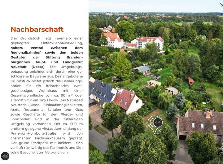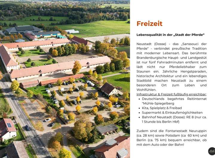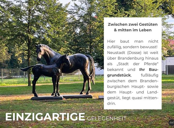Neustadt (Dosse) ist als „Stadt der Pferde“ weit bekannt und dieses Grundstück liegt ideal zwischen dem Brandenburgischen Hauptgestüt und dem Haupt- und Landgestüt. Beide Gestüte erreichen Sie in wenigen Minuten.