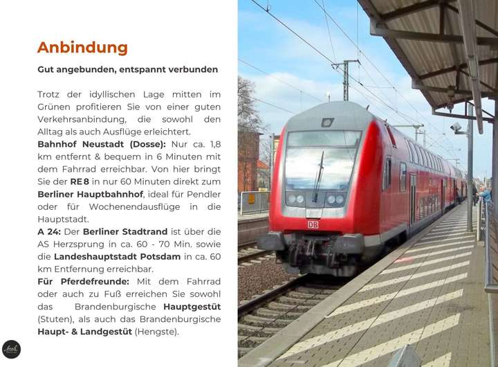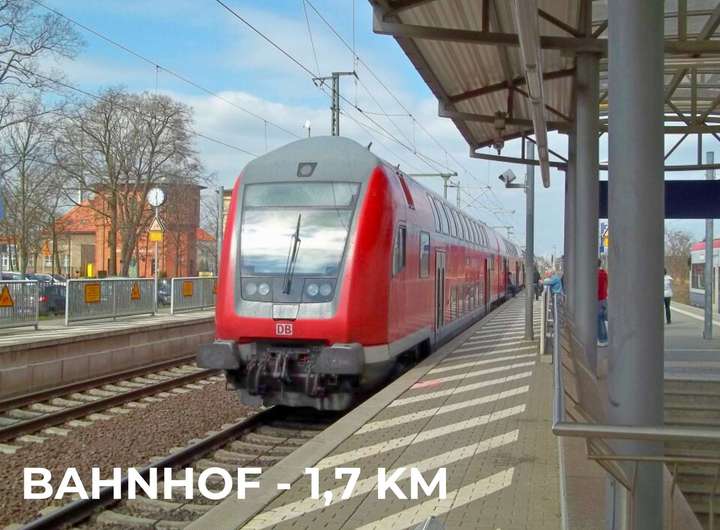 Vom Bahnhof Neustadt (Dosse) (ca. 1,8 km) bringt Sie der RE 8 in ca. 60 Minuten direkt zum Berliner Hauptbahnhof.