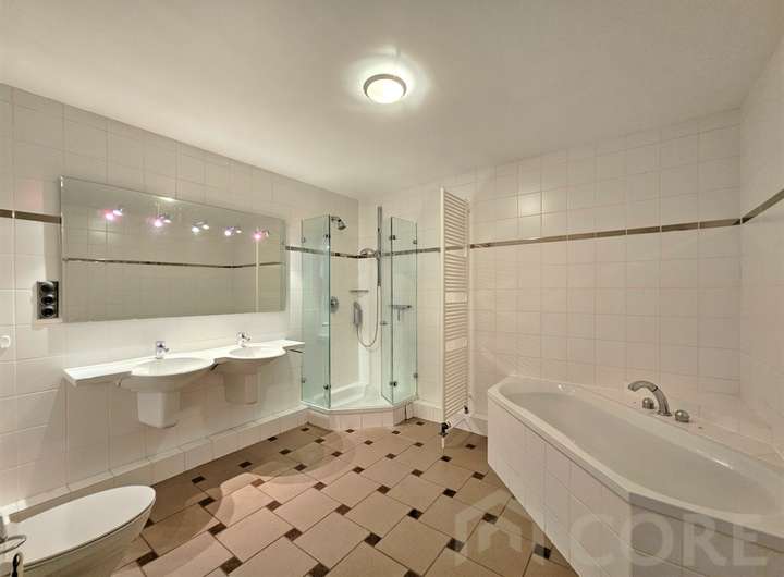 Auf Ebene vier befindet sich ein weiteres Zimmer mit Zugang zum nach Südwesten ausgerichteten Balkon, sowie ein Badezimmer mit Badewanne, Dusche, zwei Waschbecken, WC und Bidet.