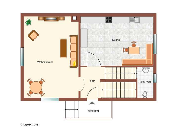Eine zweite Haustüre und man befindet sich im Vorraum des Erdgeschosses. Von hier geht es durch einen offenen Rundbogen in das Wohnzimmer, die große Wohnküche und über einige Treppenstufen zum Gäste-WC und zum Kellerabgang.
