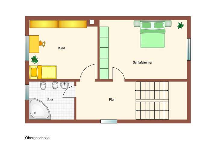 Hier gibt es wieder einen kleinen Vorraum mit Fenster, ein Schlafzimmer, einen Zwischengang der zum Tageslichtbad mit Dusche und zum Kinderzimmer oder Büro führt je nach Bedarf.