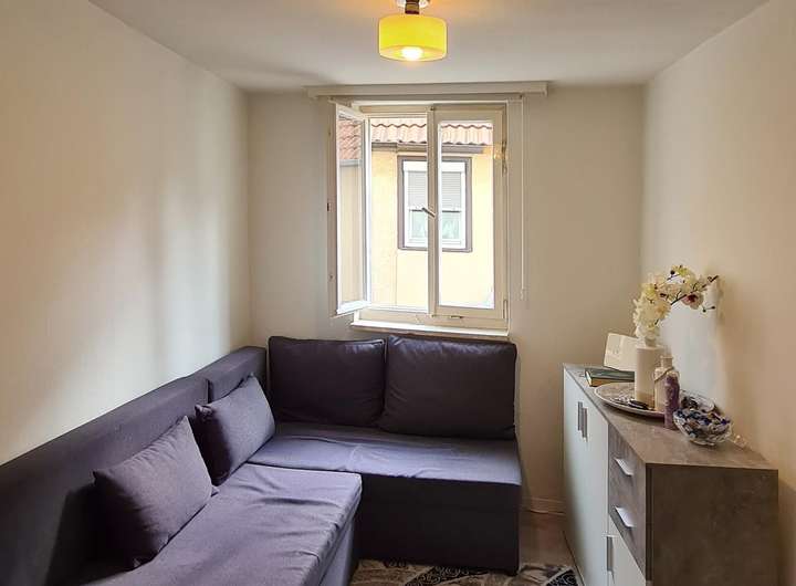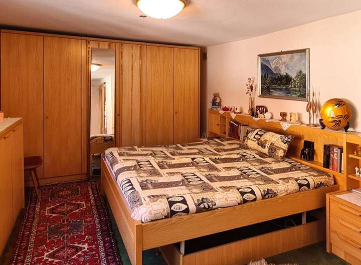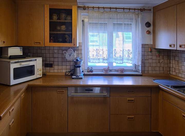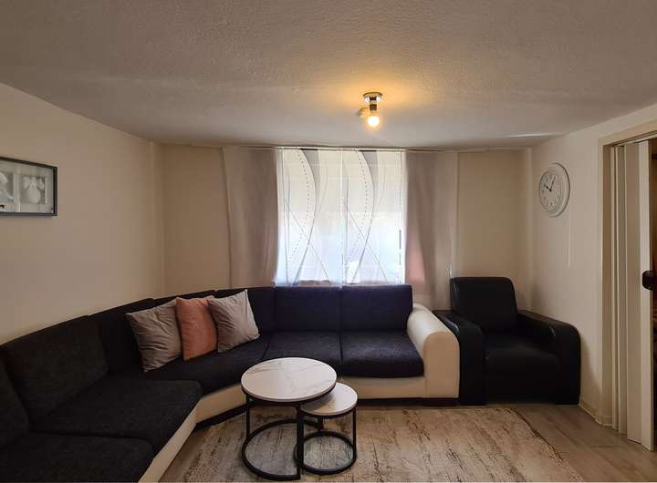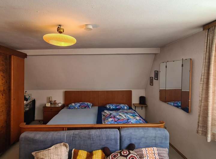 Über das Treppenhaus gelangen Sie ins Obergeschoss. Hier befindet sich eine 3,5 Zimmer-Wohnung: Den Mittelpunkt der Wohnung bildet das geräumige Wohnzimmer. Die daran angrenzende Essdiele verbindet den Wohnbereich geschickt mit der Küche. Sie ist mit allen notwendigen Elektrogeräten und Einbauschränken ausgestattet, die viel Stauraum bieten. Die zwei weiteren Zimmer eignen sich beispielsweise als Schlaf-, Kinder- oder Arbeitszimmer. Das Tageslichtbad ist mit einer Badewanne, einem Waschtisch und einer Toilette ausgestattet.