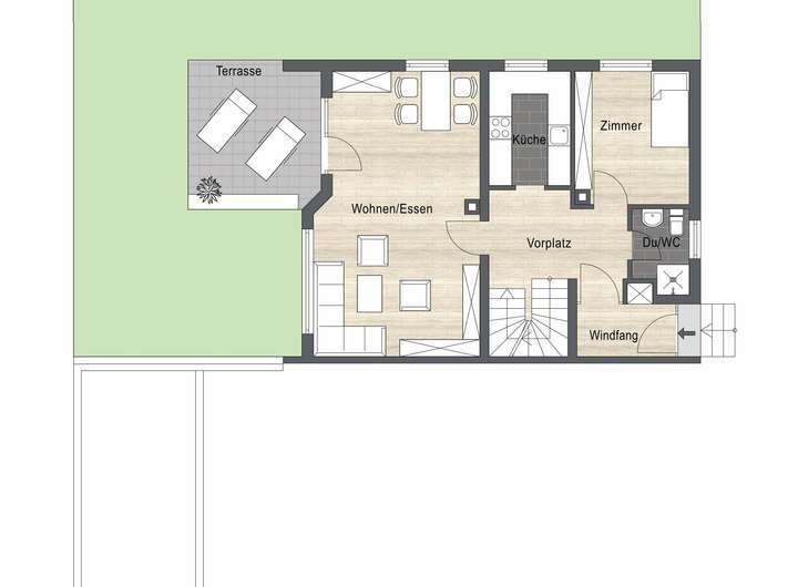 Im Erdgeschoss ist das großzügige Wohn-/Esszimmer mit Zugang zur Terrasse. Die separate Küche könnte problemlos zum Wohnbereich hin geöffnet werden. Ein weiteres Zimmer auf dieser Ebene kann z.B. als Büro, Gästezimmer oder als separates Esszimmer genutzt werden. Im Gäste-WC gibt es eine begehbare Dusche.