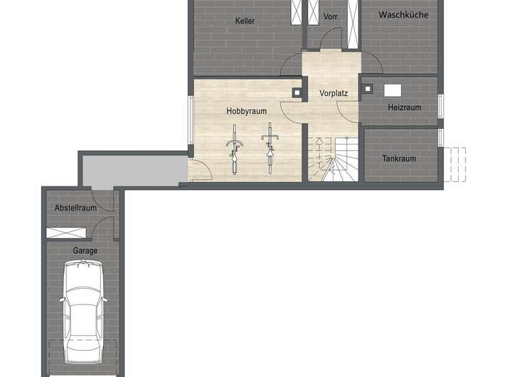 Im Untergeschoss finden Sie einen großen Hobbyraum (mit direktem Außenzugang zur Garage), einen Keller, einen Vorratsraum, die Waschküche sowie den Heizraum/Technik/Tankraum.
