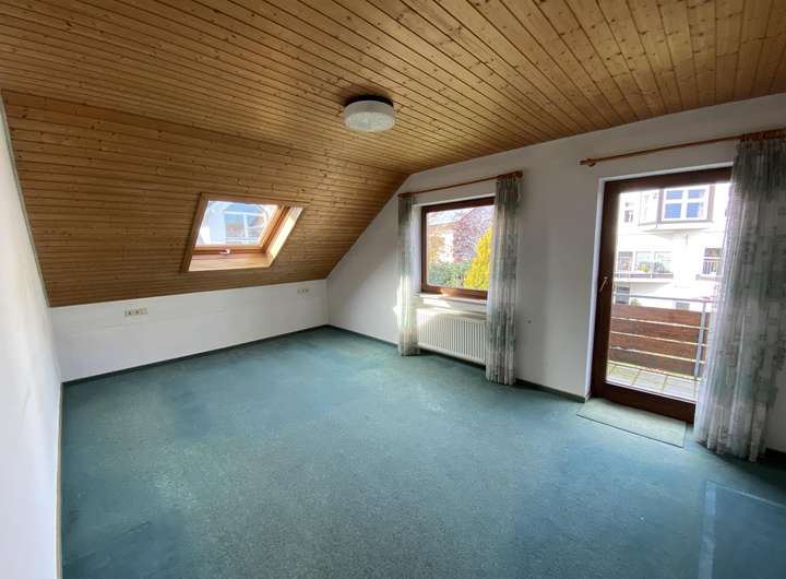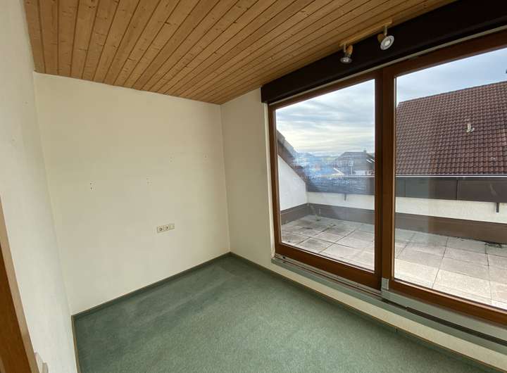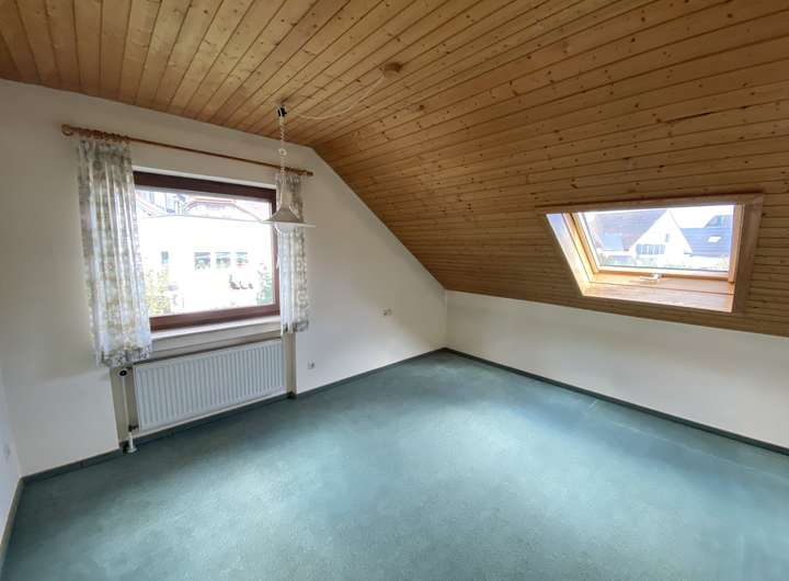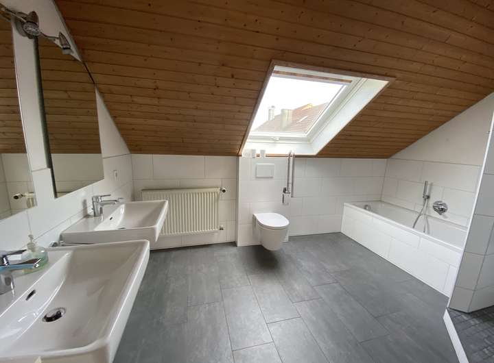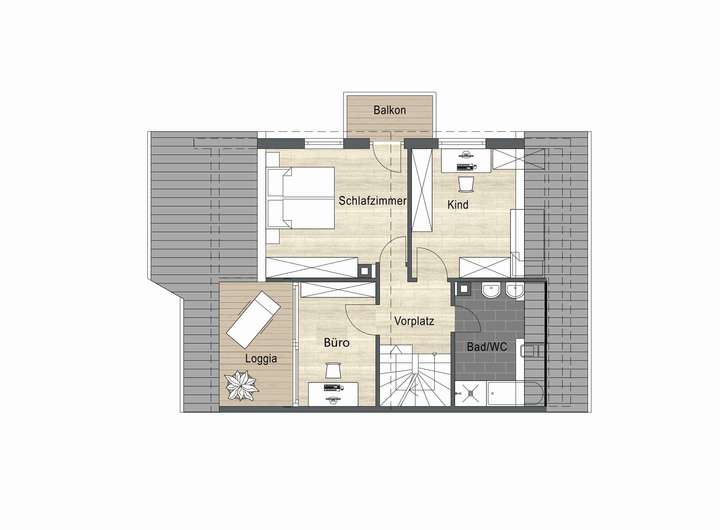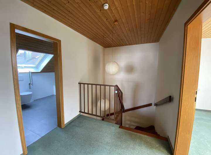 Das Obergeschoss beherbergt das Schlafzimmer mit Balkon, ein Kinderzimmer, ein Tageslichtbad mit Dusche und Badewanne sowie ein kleines Zimmer mit Zugang zur „Sonnen-Loggia“.