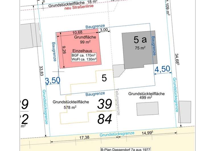Das Baugrundstück in 21521 Dassendorf liegt im Geltungsbereich des Bebauungsplans Dassendorf Nr. 7a aus dem Jahr 1977 und unterliegt der Baunutzungsverordnung von 1968.Das Gebiet ist als allgemeines Wohngebiet (WA) ausgewiesen; zulässig sind Einzelhäuser in offener Bauweise mit einem Vollgeschoss. Bei dem Grundstück handelt es sich um ein ideell geteiltes Grundstück.