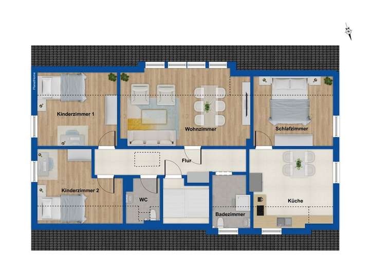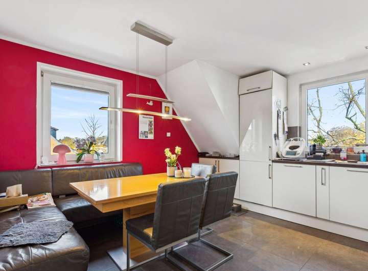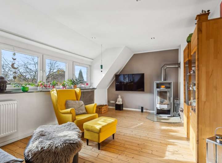 Die Dachgeschosswohnung wurde bereits 2012 umfassend saniert und präsentiert sich in einem sehr gepflegten Zustand. Sie verfügt über eine Küche mit Essbereich, ein Wohnzimmer, zwei Kinderzimmer, ein Schlafzimmer sowie ein modernes Badezimmer mit Dusche und Fenster. Zusätzlich steht ein Gäste- WC zur Verfügung.