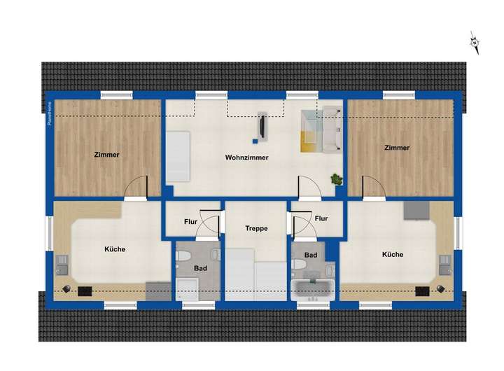 Im Obergeschoss befinden sich zwei weitere Wohnungen. Die rechte Wohnung umfasst eine Küche, ein Kinderzimmer, ein Wohnzimmer sowie ein Badezimmer mit Badewanne und Fenster. Die Wohnung auf der linken Seite bietet ein Schlafzimmer, eine gemütliche Wohnküche sowie ein Tageslichtbad mit Dusche.