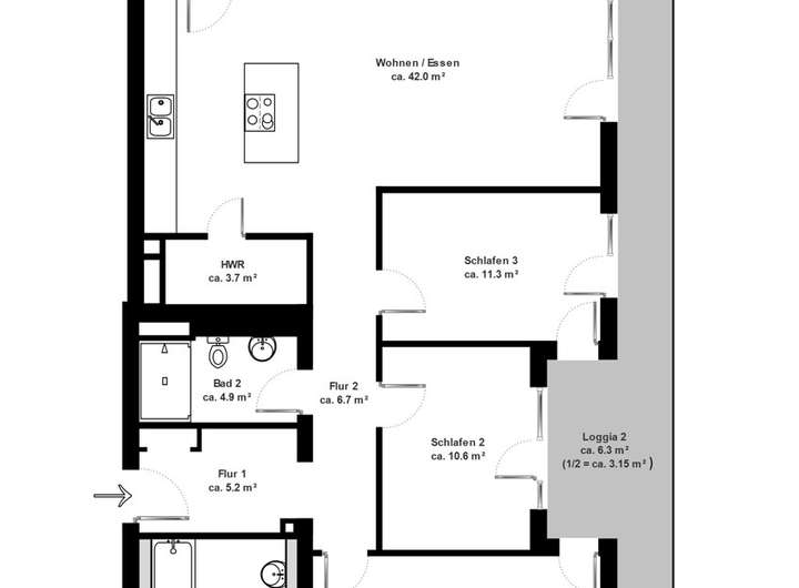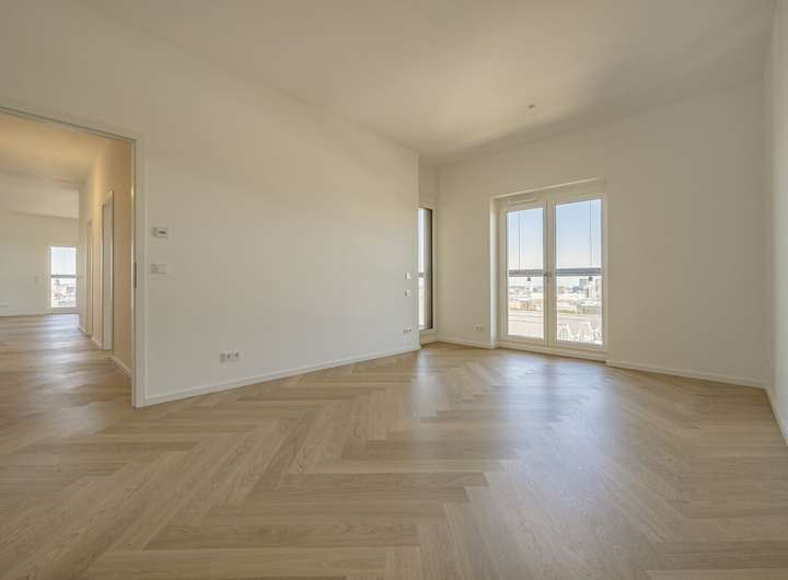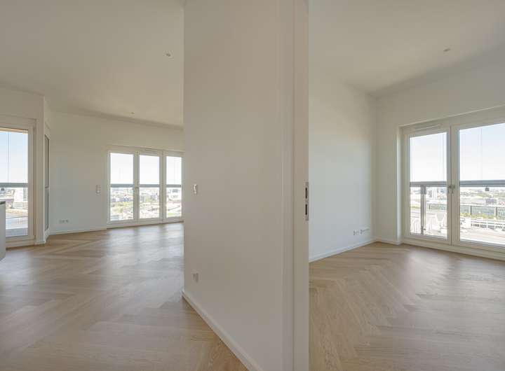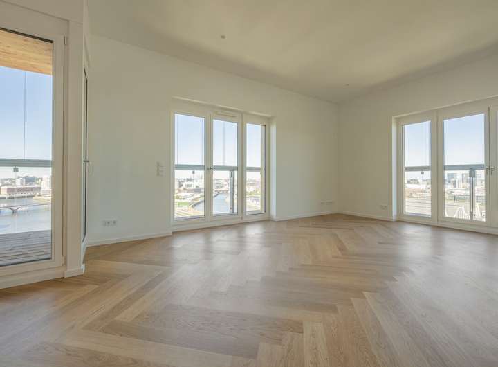 Die Wohnung befindet sich in der Endetage und nimmt innerhalb des Hauses eine besondere Stellung ein. Sie überzeugt durch ihre optimale Ausrichtung, die erhöhte lichte Raumhöhe und den unvergleichlichen Blick über die Elbe und die Hansestadt. Zwei Aufzüge ermöglichen den bequemen Zugang. Der lichtdurchflutete Wohn- und Essbereich mit bodentiefen Fenstern öffnet sich zu einem beeindruckenden Panorama und wird durch zwei geschützte Loggien harmonisch ergänzt. Die offen integrierte Küche unterstreicht den modernen, kommunikativen Charakter. Das Hauptschlafzimmer verfügt über ein Vollbad en suite und Zugang zu einer Loggia mit Blick Richtung Innenstadt. Zwei weitere Zimmer eignen sich ideal als Gäste-, Kinder- oder Arbeitszimmer. Ein Duschbad, ein Hauswirtschaftsraum mit Waschmaschinenanschluss sowie ein separater Abstellraum in der oberen Etage runden das Raumangebot ab. Hochwertige Materialien wie großformatiges Feinsteinzeug, Armaturen renommierter Hersteller und ein edler Eichenboden im Fischgrätmuster verleihen der Wohnung eine zeitlos elegante Atmosphäre. Eine neu installierte SieMatic-Küche mit perlgrauen Fronten fügt sich nahtlos in das Wohnkonzept ein.