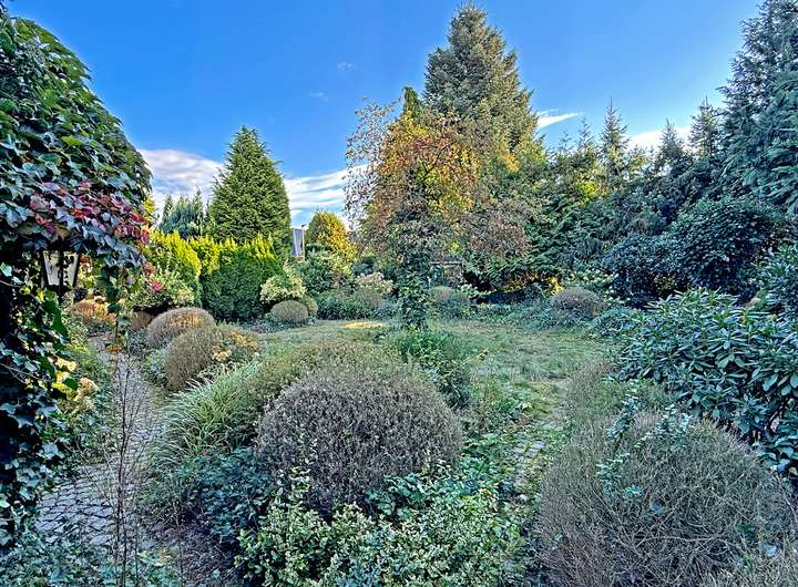 Beim Betreten des Hauses empfängt Sie ein einladender Eingangsbereich, der nahtlos in den großzügigen Wohnbereich übergeht. Die großen Fensterfronten lassen viel Tageslicht herein und bieten einen herrlichen Blick ins Grüne. Der angrenzende Wintergarten erweitert den Wohnraum und schafft eine Oase der Ruhe.