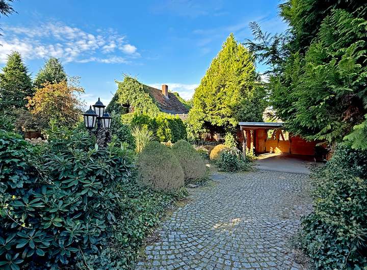 Der Garten ist grün angelegt und befindet sich durch die zweite Baureihe in absoluter Ruhe. Ein Doppelcarport rundet das Bild ab.