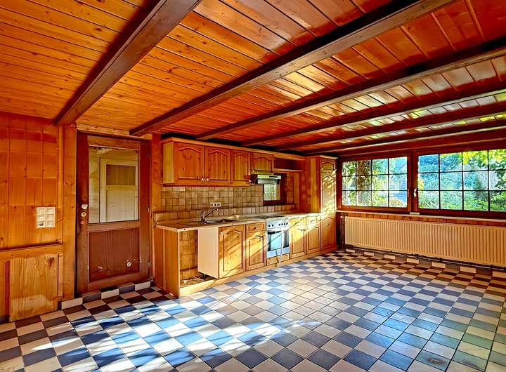 - Küche mit Fliesenboden und Holzverkleidung