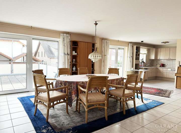 Die Wohnung beeindruckt durch einen lichtdurchfluteten Wohnbereich mit vielen Fenstern und einem offenen Grundriss, der maximale Bewegungsfreiheit ermöglicht. Der Wohn- und Essbereich bildet das Herzstück des Zuhauses und bietet zahlreiche Gestaltungsmöglichkeiten. Ursprünglich wurde die Wohnung aus zwei separaten Wohneinheiten schon im Bau zusammengelegt.