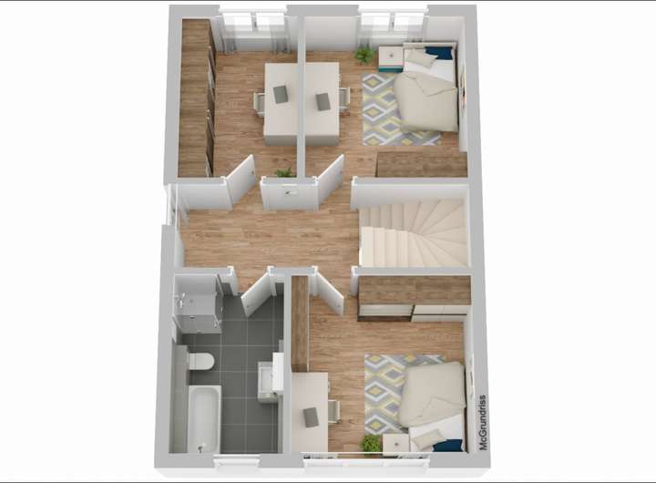 Im Innenausbau wird besonderer Wert auf Qualität gelegt: edles Eichenparkett, moderne Fliesen in den Bädern, Sanitärobjekte namhafter Hersteller wie Geberit und Hansgrohe sowie eine elegant ausgeführte Stahl-Holz-Treppe prägen das Erscheinungsbild. Jeder Einheit steht ein eigener Technikraum zur Verfügung, ebenso Anschlüsse für Waschmaschine und Trockner im Erdgeschoss. Elektrische Rollläden und eine Video-Gegensprechanlage erhöhen Komfort und Sicherheit.