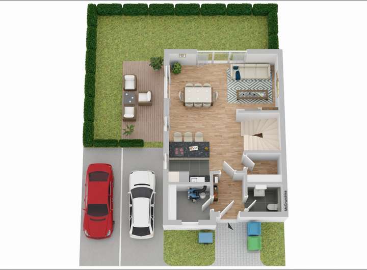 Die Doppelhaushälften werden in massiver Bauweise errichtet und verfügen über durchdachte Grundrisse mit großzügigen, lichtdurchfluteten Wohnbereichen. Große Fensterflächen mit Dreifachverglasung, eine Luft-Wasser-Wärmepumpe sowie eine komfortable Fußbodenheizung schaffen ein angenehmes Wohnklima und tragen zu niedrigen Energiekosten bei.