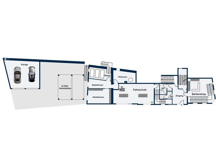 Diese Ebene umfasst zwei attraktive Gewerbeeinheiten – eine Fahrschule (ca. 50 m²) und ein Barbershop (ca. 36 m²) – sowie die Garagen, der Heizraum und das Öllager.