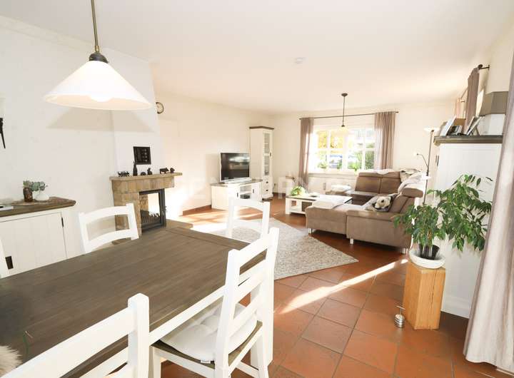 - freundlicher, heller Wohnbereich mit teilweise bodentiefen Fenstern und Kamin