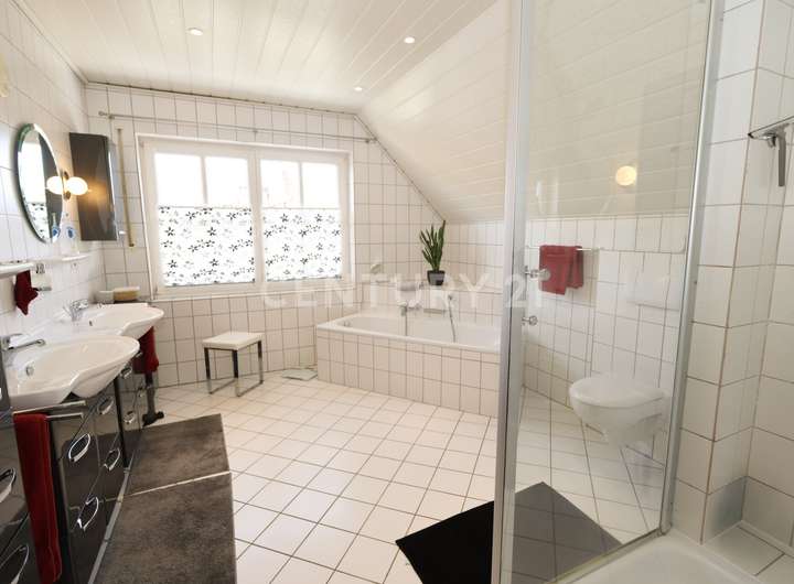 - weiß gefliestes Badezimmer mit Wanne, Dusche und zwei Waschbecken (teilerneuert)