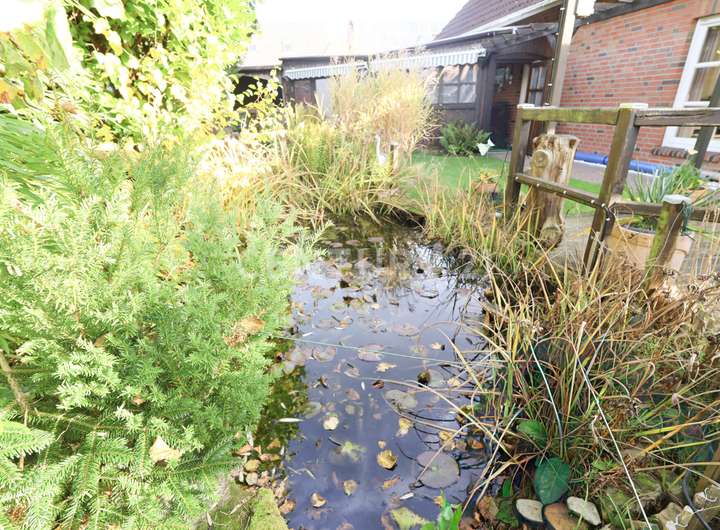 liebevoll angelegt mit Palmen, dichter Heckenbepflanzung, einem kleinen Pool mit Sandfilteranlage und einer Teichanlage. Eine überdachte Terrasse, ein Holzgartenhaus, eine Gartenpumpe sowie ein weiterer Holzschuppen (erneuerungsbedürftig) runden den Außenbereich perfekt ab.