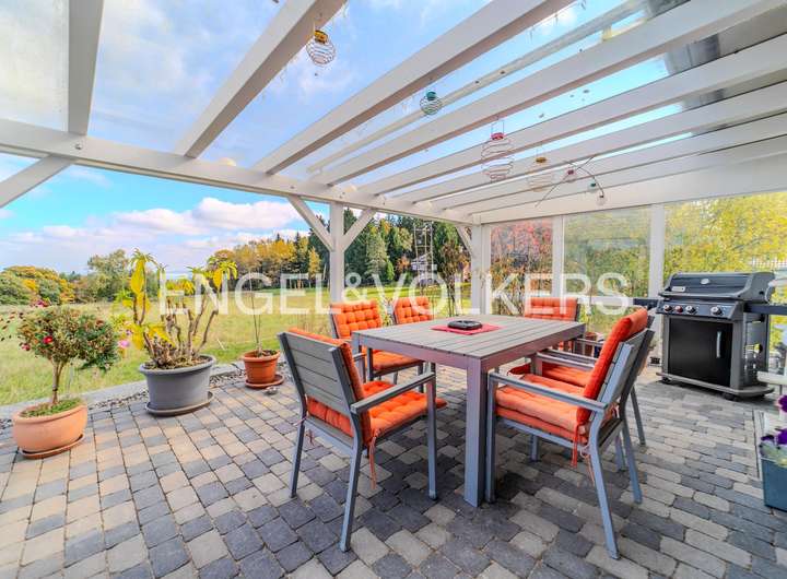 Ein besonderes Highlight ist die überdachte Terrasse im Eingangsbereich, die nicht nur einen geschützten Platz zum Entspannen, sondern auch einen herrlichen Blick in die Natur bietet.